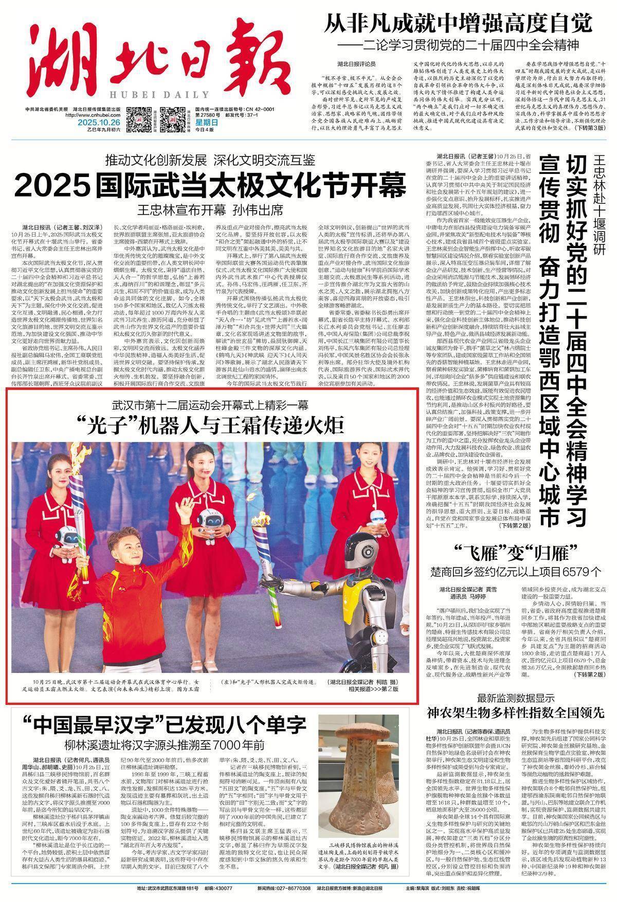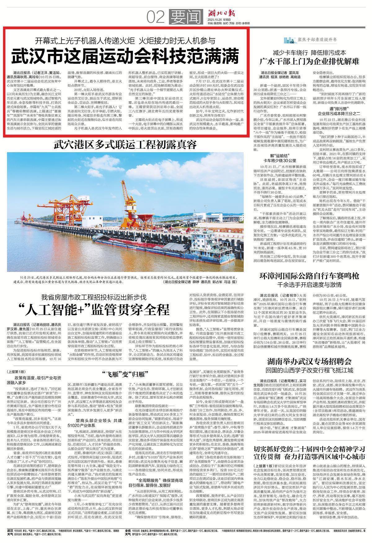 10月26日,湖北日报头版大图、二版头条报道: